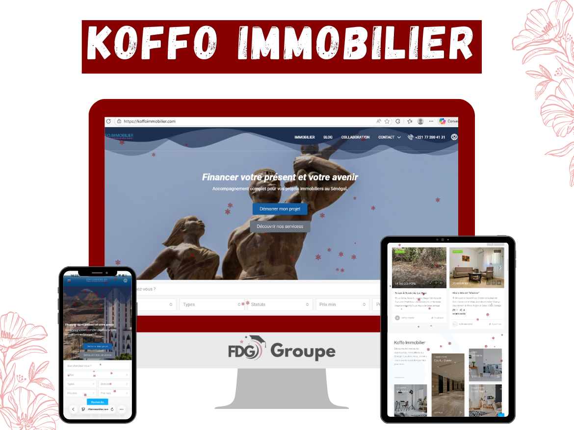 Koffo Immobilier est une plateforme immobilière complète au Sénégal, spécialisée dans les annonces de terrains, maisons meublées et vides, avec un service unique de coaching immobilier pour accompagner acheteurs et investisseurs. FDG Agency a conçu et développé un site web moderne qui positionne Koffo Immobilier comme la référence du marché immobilier sénégalais, combinant marketplace d’annonces et expertise conseil.
